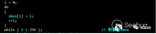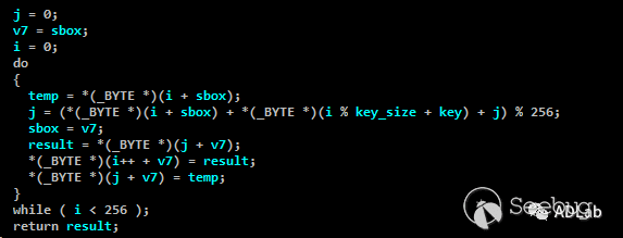 3) 密鑰流的生成是從 sbox[0] 到 sbox[255],對每個 sbox[i],根據當前 sbox值,將 sbox[i] 與 sbox 中的另一個字節置換,然后使用密鑰進行替換。當數組 sbox完成初始化之后,輸入密碼便不再被使用。