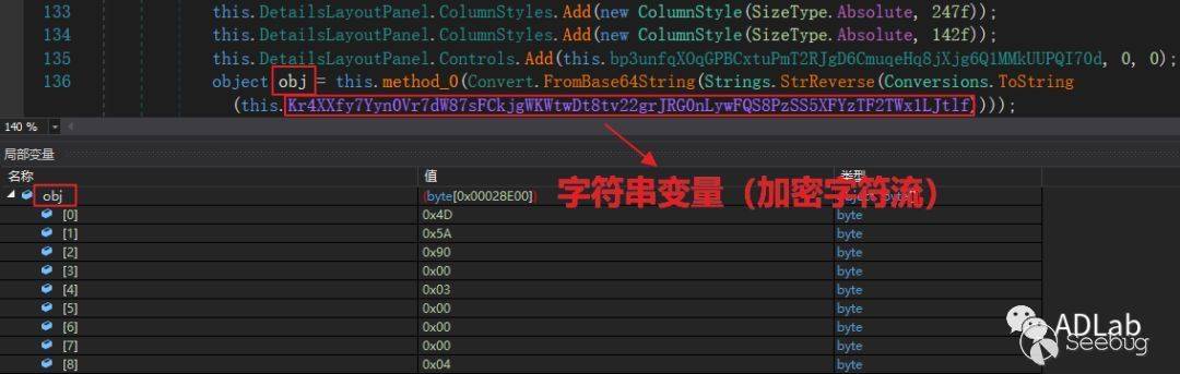 “massive.exe”從資源中提取并解碼出加密字符流,之后通過StrReverse函數將該字符流逆序排列,再經FromBase64String函數解碼,最后通過自定義的解密函數method_0解密得到PE文件“DUMP1.exe”。