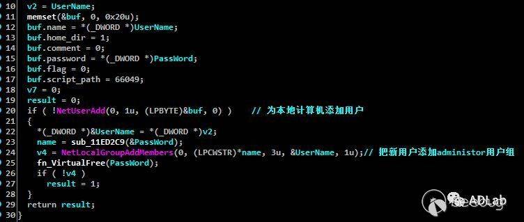 接著,該木馬將上文解碼出的賬戶名和密碼作為新用戶加入到 administor 用戶組中。這樣便可使用非管理員用戶來進行遠程桌面登錄。