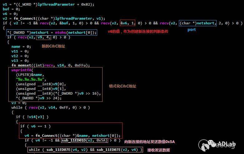 在新線程中,根據遠程服務器發送的指令,與新指定的 C&C 進行連接。