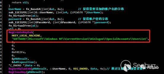 首先,該木馬會調用fn_Base64自定義函數,解碼出后續需要添加的賬戶名和密碼。并設定Software\Microsoft\Windows NT\CurrentVersion\Winlogon\SpecialAccounts\Userlist注冊表值為 0 來隱藏新創建的賬戶。