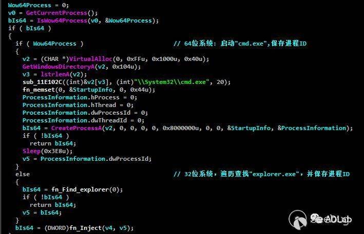當成功解密出 C&C 地址后,該木馬則開始將一段 Shellcode 代碼注入到傀儡進程中。在注入功能開啟時,木馬程序首先會根據操作系統架構(64/32)來選擇注入到 cmd.exe 或 explorer.exe 中。相關代碼如下圖所示: