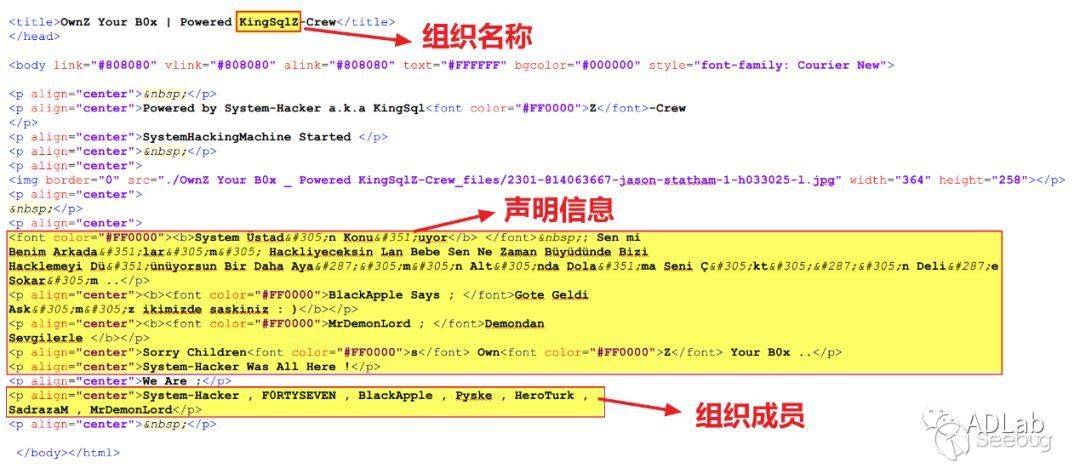 通過對攻擊者的行為和所用服務器相關信息的分析和追蹤,確定該次攻擊來源于一批隱秘多年的土耳其黑客組織-KingSqlZ黑客組織。該組織是一個民族主義色彩非常濃厚的黑客組織,曾攻下其他國家的3千多個網站服務器,并高調的在被攻擊網站上留下其組織的名稱,隨后消失了多年。 如今通過我們對”黑獅行動”的追蹤再次挖出該黑客組織的活動跡象。本次攻擊過程中,該黑客組織采用滲透手段攻下多臺服務器并將其作為存放攻擊代碼的跳板。