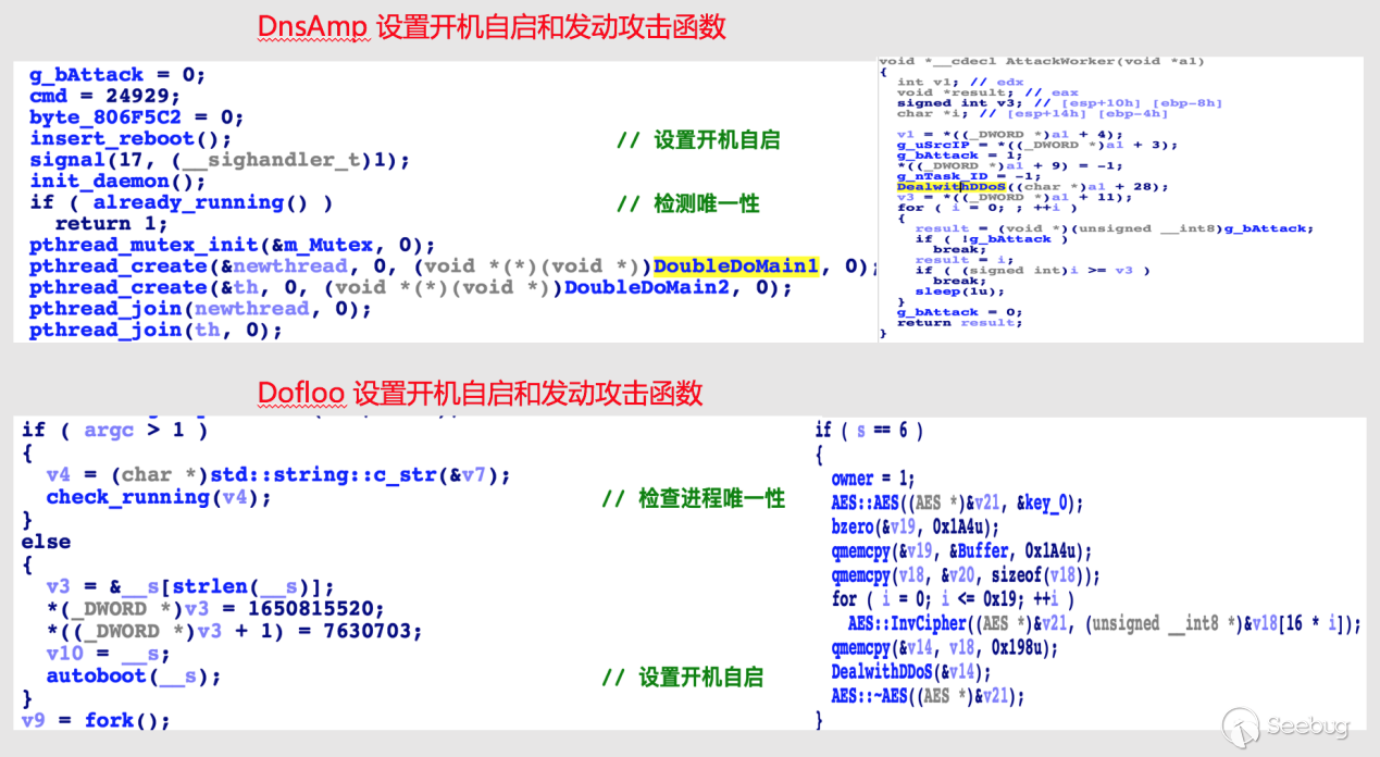 在 DnsAmp 與 Dofloo 家族的對比中,我們發現其代碼差別較大,但是主要攻擊代碼以及程序整體設計思路比較相似。在 DnsAmp 家族中,持久化仍然是通過設置“/etc/rc.d/rc.local”來保持開機自啟,并且在啟動后同 Dofloo 一樣,會首先確定進程的唯一性。而它的攻擊線程“AttackWorker”中,我們發現同 Dofloo 一樣具有同名的攻擊函數“DealwithDDoS”,只不過僅有 4 種攻擊方式,分別為 udp,icmp,dnsAmp,syn 攻擊。雖然 DnsAmp 與 Dofloo 整體代碼相似度不是太高,但是根據其主要攻擊代碼和程序整體的設計思路,我們推測二者具有關聯性,至少 DnsAmp 為參考 Dofloo 代碼而產生的相似變種。部分對比圖如下: