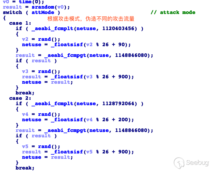 比較有趣的是,下游的黑客在發動 DDoS 攻擊的時候,可能根本不會想到,主控中顯示的惡意程序的攻擊流量速率幾乎都是偽造的。我們在SendInfo線程中發現,當惡意程序執行 DDoS 攻擊時,會調用“fake_net_speed”函數,該函數會根據不同的 DDoS 攻擊的模式,在一個固定的范圍內偽造攻擊流量速率。下圖為對部分計算隨機流量的截圖: