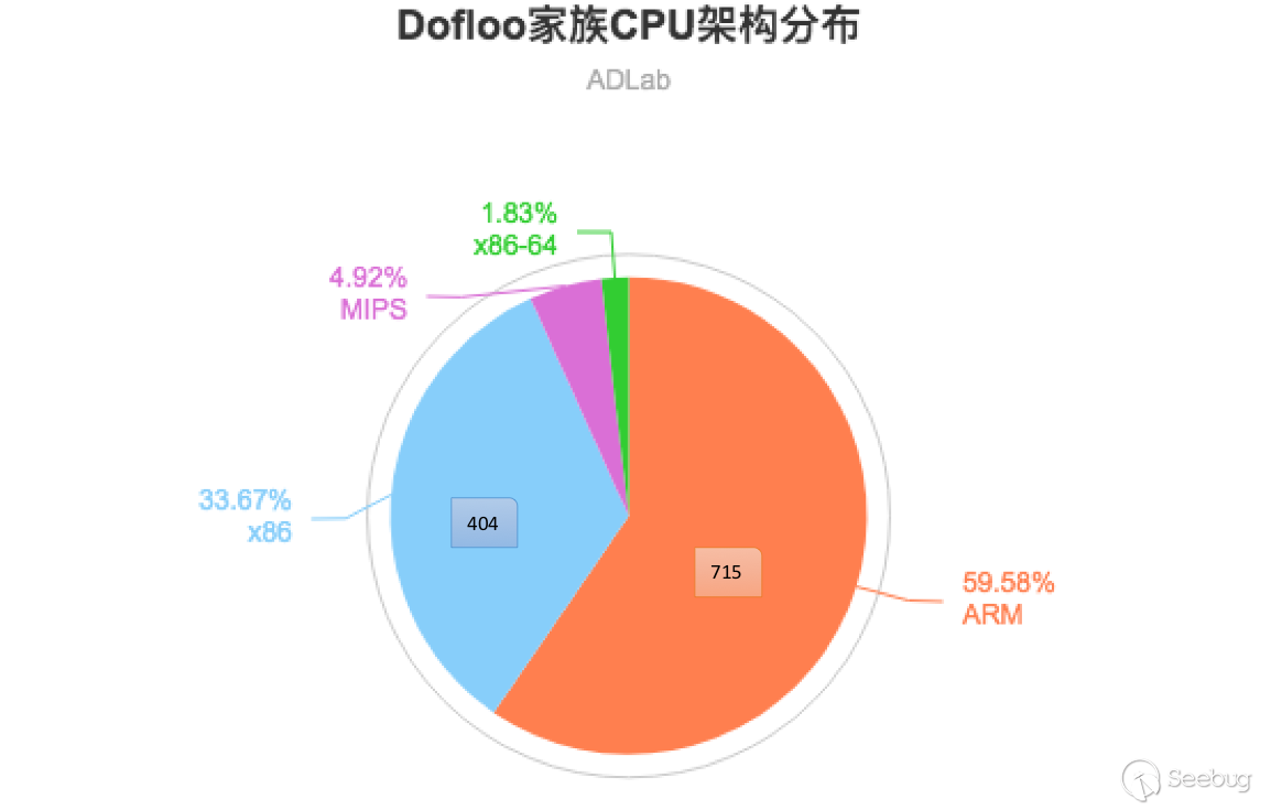 由于 Dofloo 支持多種 CPU 架構,我們在對這些平臺的樣本分析中發現,所有 Dofloo 支持的架構,都存在黑雀現象。但是僵尸作者對不同的架構的黑雀C&C處理略有不同,這對自動化分析也造成了一定的影響。我們對本次收集的共計 1200 個樣本的架構所占比例進行了統計,繪制成圖如下: