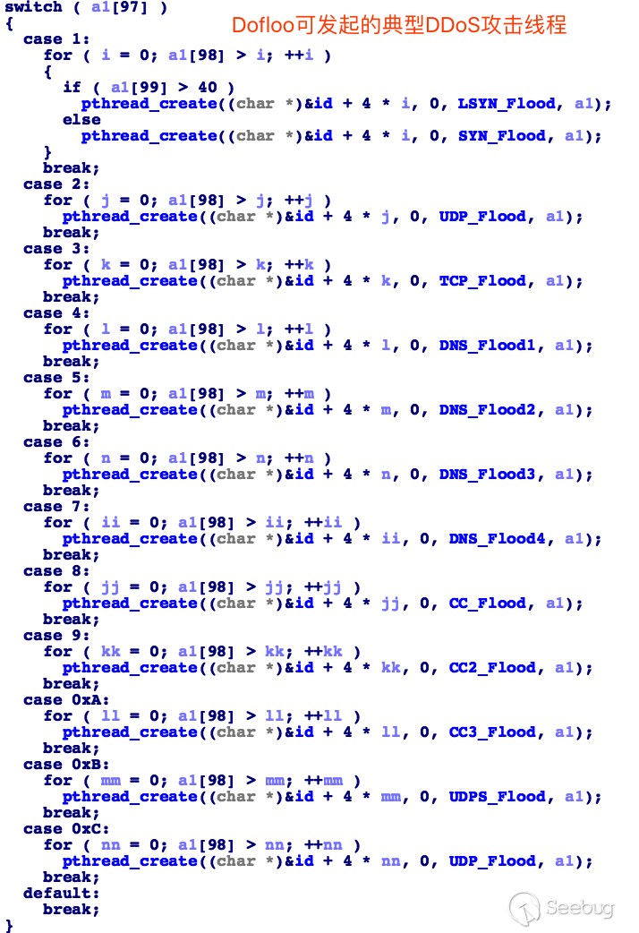 只不過 Mr.Black 中僅有 5 種 DDoS 攻擊方式。通過查閱 Mr.Black 的源碼,發現 Mr.Black 源碼中并沒有黑雀后門線程和 AES 加密,沒有遠控部分,僅能發起 DDoS 攻擊。因此推測 Dofloo 為參考 Mr.Black 代碼更改后的變種。