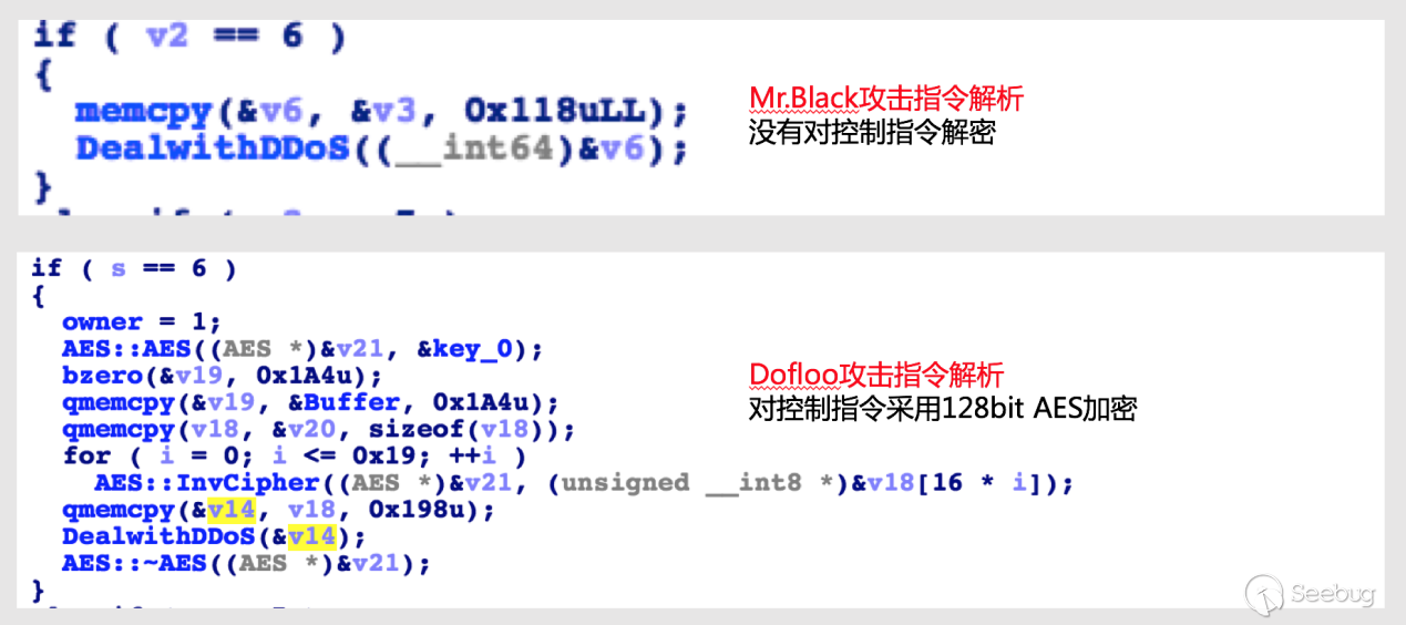 并且還可以看到 Mr.Black 同樣有同名的,發起 DDoS 攻擊的函數 DealWithDDoS,其發起攻擊的控制指令編碼也相同。