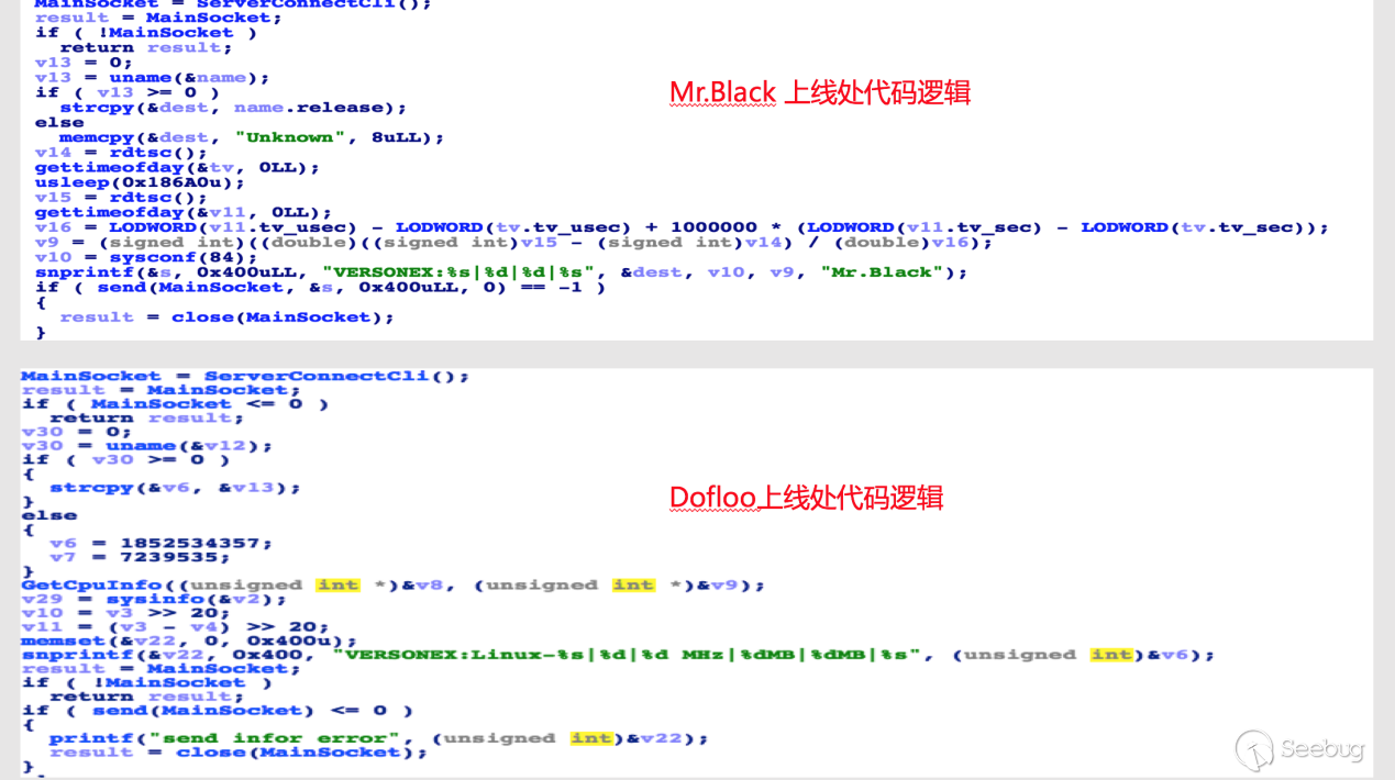 通過對 Dofloo 僵尸網絡進行同源性分析,發現 Dofloo 僵尸網絡家族同 Mr.Black 僵尸網絡家族、Flood.A 以及 DnsAmp 僵尸家族有很高的相似度。首先,我們對 Mr.Black 家族中的典型樣本和 Dofloo 家族的典型樣本進行了對比,發現這兩個家族的整體流程和部分代碼高度相似,比如下圖中的上線機制部分,通過對比可以看到,上線包的內容和格式也極為相似: