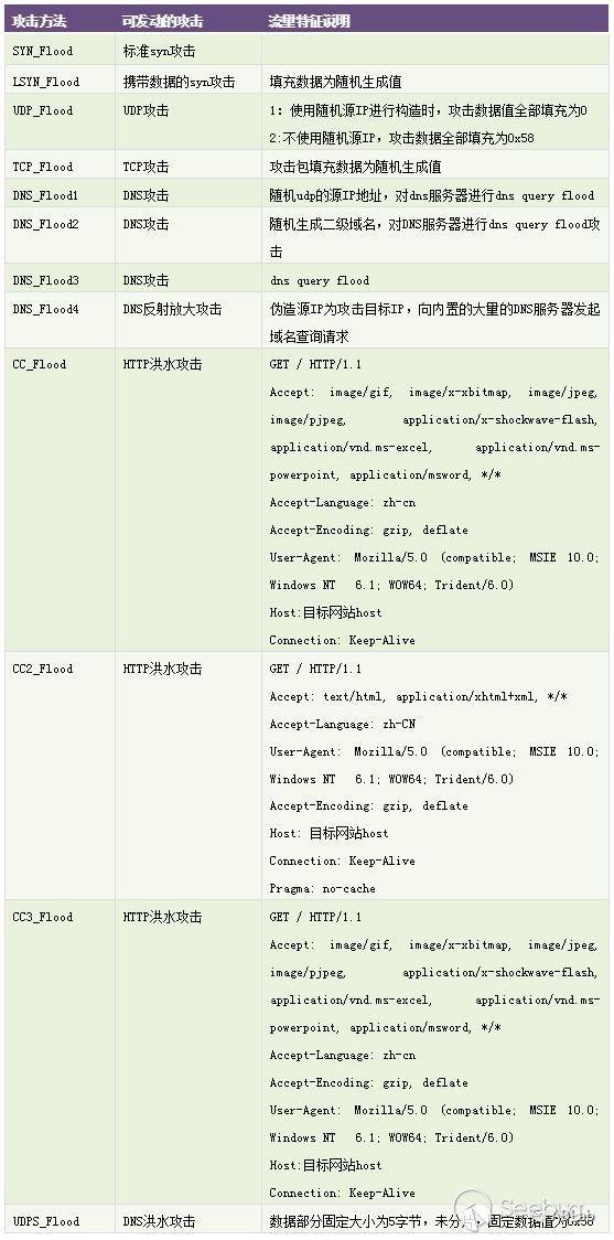 并且我們對 Dofloo 的攻擊方法進行了分析總結,并對部分攻擊方法的流量特征進行了提取,制作流量特征表如下: