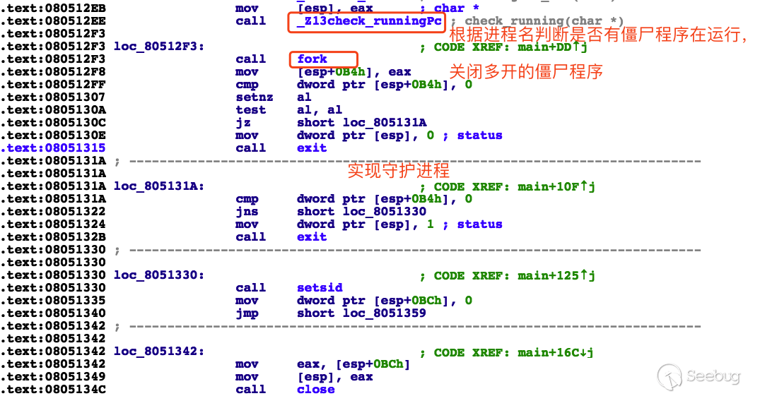 僵尸程序通過對比系統中運行的進程名來確保運行進程的唯一性,并調用 fork 函數創建守護進程。