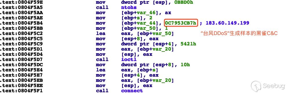 通過對早期的“臺風DDoS”的僵尸模板程序分析發現與Dofloo黑雀C&C相同的后門C&C:183.60.149.199。