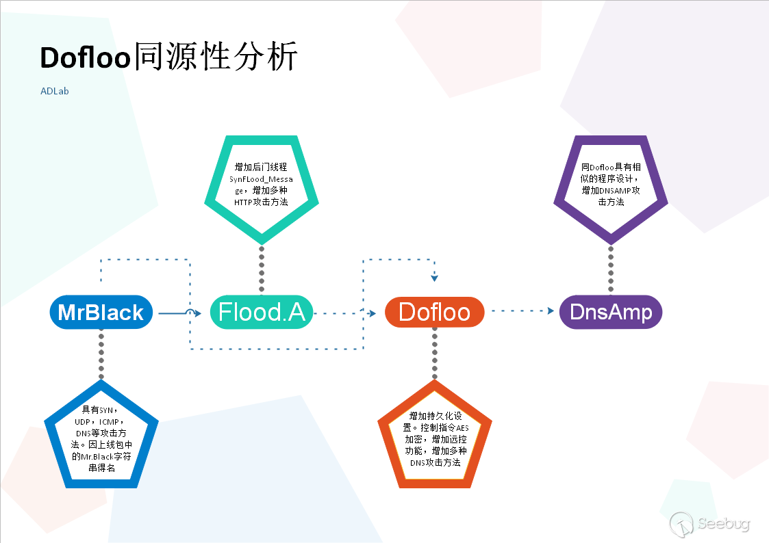 因此,我們大致可以推測出如下的關系:MrBlack可能為原始惡意程序,Flood.A為其變種,主要增加的功能有后門黑雀線程和HTTP洪水攻擊;Dofloo可能為Mr.Black或Flood.A的變種,主要新增的特性有程序持久化設置,控制指令AES加密,以及添加多種DDoS攻擊方法;推測DnsAmp為Dofloo的變種,它參考了Dofloo的部分代碼和設計思路。我們總結其四者的關系圖如下: