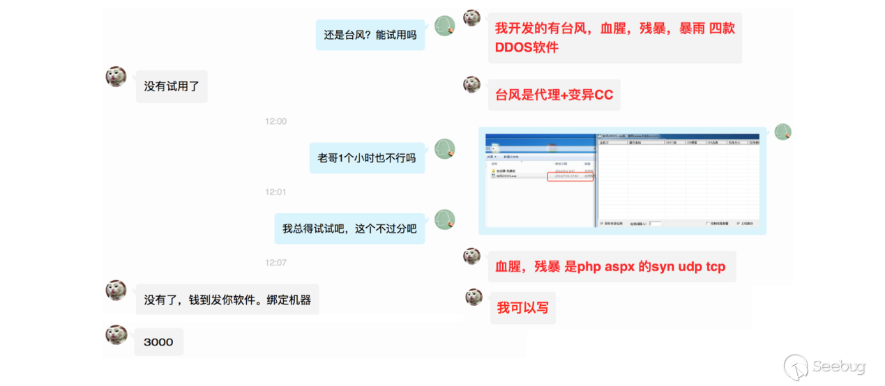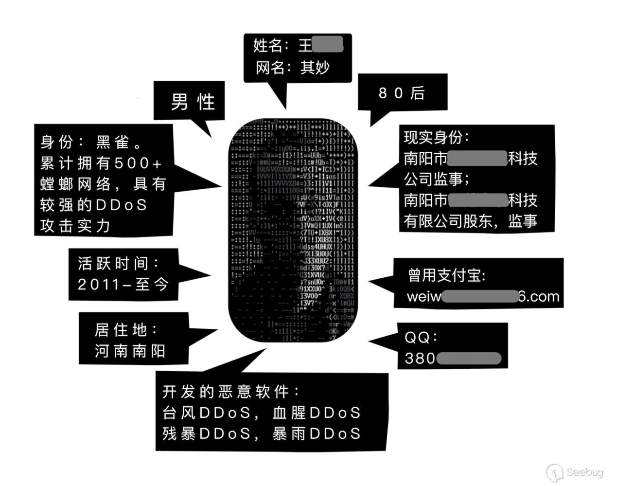 幸運的是我們在“臺風DDoS”的售賣歷史記錄中發現一起欺詐事件,事件中一位購買者披露了販賣人員的 QQ 號碼和支付寶賬號。通過進一步分析,我們最后確認了該販賣人員的 QQ 便是“臺風DDoS”開發者的事實。此外我們還通過該 QQ 的關聯信息收集到該人員有多年黑產從業歷史:如其從 2011 年開始編寫 DDoS 軟件,并創建“臺風工作室”;同時其還從事與 DDoS 相關的黑產業務,并通過販賣惡意攻擊軟件和發動 DDoS 攻擊來謀取非法收益。而此黑客便是我要溯源的 Dofloo 僵尸網絡背后的黑雀,其除了開發有“臺風DDoS”僵尸軟件外,還開發多款 DDoS 攻擊工具如:血腥DDoS、殘暴DDoS 和暴雨DDoS 等。