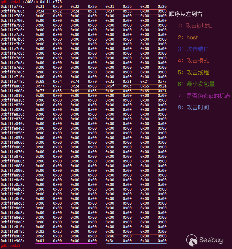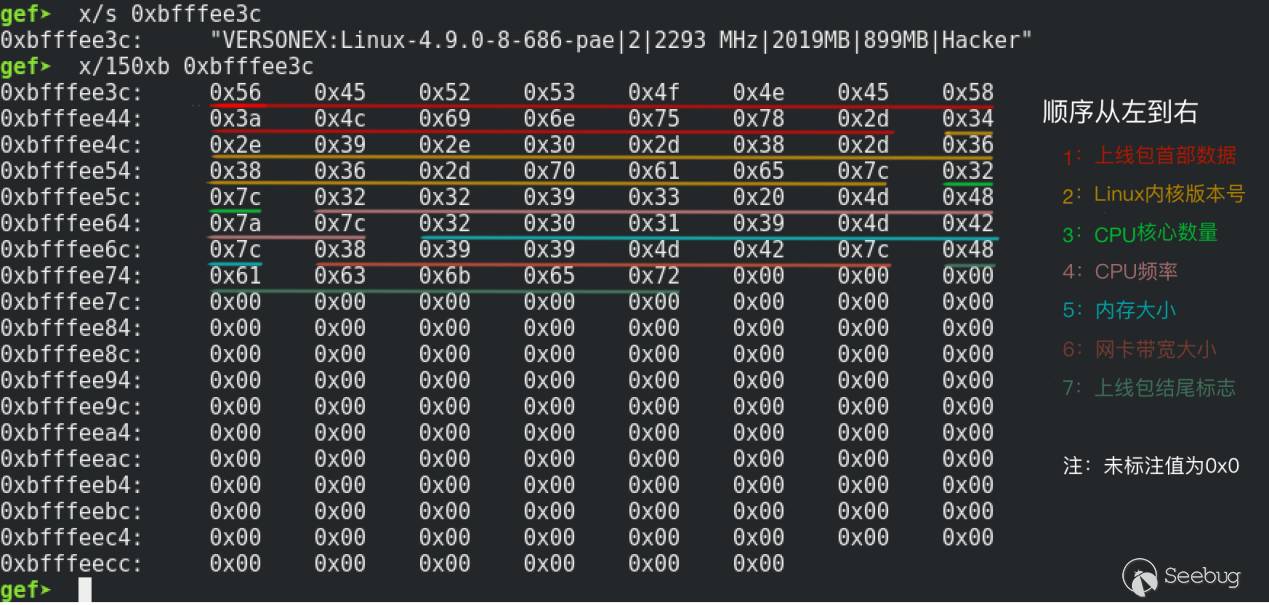 在安裝機制設置完畢后,僵尸程序與控制端 C&C 進行連接。此時惡意程序會收集被入侵設備的系統信息,并把這些信息作為上線包的內容發送到控制端處。這個上線包的內容包含內核版本、CPU 頻率、總內存大小、網口帶寬以及一些硬編碼字符串,比如“VERSONEX”和大量樣本中出現的“Hacker”。在黑雀的線程中,其上線機制的主體功能與螳螂線程處的功能相似度極高。不同的是,黑雀線程會延遲 15 小時和 40 分鐘上線,這往往會迷惑分析人員并可能逃避自動化沙箱的檢測,使得黑雀 C&C 隱匿在大量的請求中,減少被發現的可能。通過對大量樣本的分析,我們發現上線包的固定大小為 0x400 字節,并對上線包格式解析、提取后歸納整理出真實的數據結構,其在內存中的分布如下圖所示: