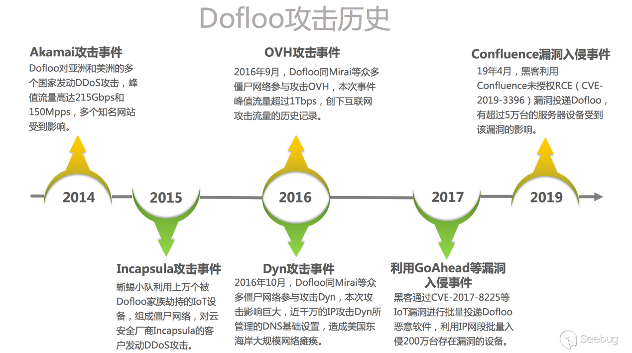 此外,Dofloo 還在 2016 年 9 月同 Mirai 僵尸一起參與了云計算公司 OVH 的攻擊,本次攻擊的流量超過了 1Tbps,創下了分布式拒絕服務攻擊的歷史記錄,而同年的 10 月再次參與了 Miarai 僵尸主導的對域名服務商 Dyn 的大規模 DDoS 攻擊,致使整個美國東海岸的網絡處于極度癱瘓的狀態。2019 年的 4 開始利用最新披露的遠程代碼執行漏洞 CVE-2019-3396 進行大面積傳播,攻占了相當數量的網絡設備。下圖是我們根據 Dofloo 僵尸網絡所實施的比較重要的攻擊事件所繪制的攻擊歷史圖: