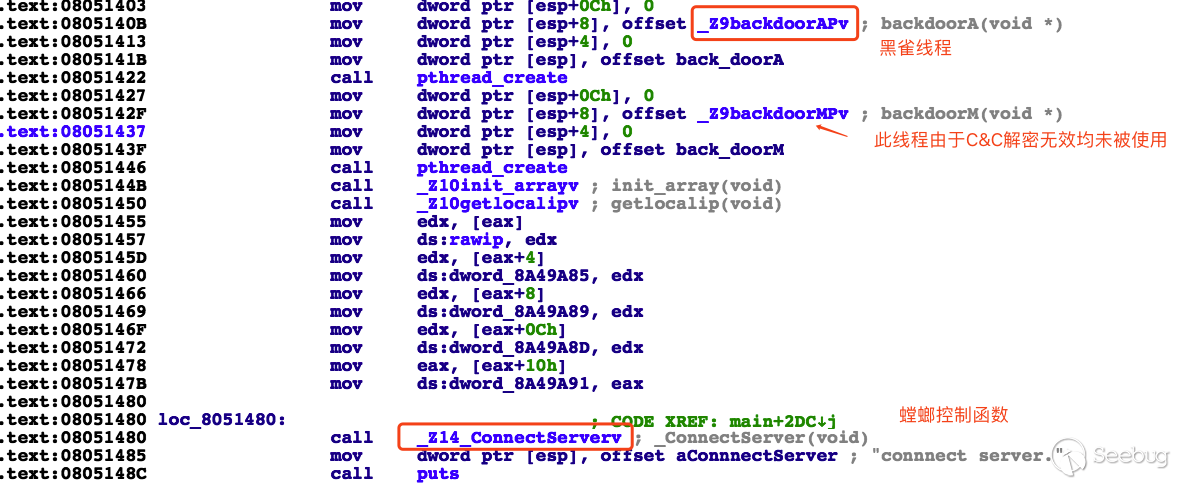 在長期的對僵尸網絡的研究中,Dofloo一直是我們監控的對象。在之前的研究中,通過自動化分析該家族的關聯樣本,發現該家族的大部分樣本都會啟動兩個新的攻擊線程,并發現這兩個線程存在異常行為。如:不僅會設置延遲啟動線程,還會嘗試跟另一個C&C控制端進行連接通信。因此,我們對這些樣本進行了進一步的分析,最終確定該僵尸生態中被植入了黑雀。