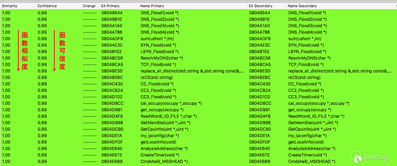通過對樣本的分析,結合樣本中的函數命名習慣、攻擊流量特征、變種源碼注釋以及樣本爆發傳播時用來散播樣本的HFS面板語言等特征,我們判定該家族由國內的黑客編寫。于是我們溯源目標鎖定在國內,通過對黑雀域名“aaa.tfddos.net”中關鍵信息 “tfddos”,我們關聯到一款名為“臺風DDoS”的僵尸軟件。并且通過進一步分析發現,該僵尸軟件的模板樣本與 Dofloo 僵尸具有極為相似的行為和網絡特性。此外,“臺風DDoS”在黑客間活躍的時間同 Dofloo 爆發時間均在 2014 年。根據以上一系列的證據證明他們之間存在一定同源性。為了進一步確認他們為同一款僵尸程序,我們還利用 bindiff 對“臺風DDoS”控制端生成的僵尸與 Dofloo 的樣本進行了相似度比對,發現兩者代碼相似度為 100% 的代碼占比超過 98%,因此可以確定“臺風DDoS”便是 Dofloo 家族的一個主控。對比圖如下: