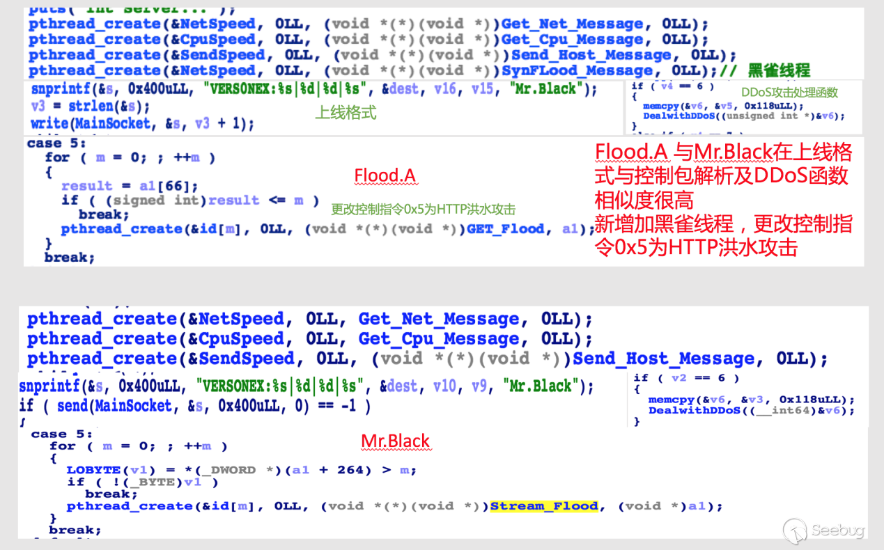 然后通過 Flood.A 同 Mr.Black 和 Dofloo 家族進行對比,發現 Flood.A 家族較 Mr.Black 家族新增“SynFLood_Message”黑雀后門線程,“DealwithDDoS”函數中增加 Layer7 層的 HTTP 洪水攻擊,沒有 AES 加密和遠控功能,與 Mr.Black 家族較為相似,部分對比圖如下: