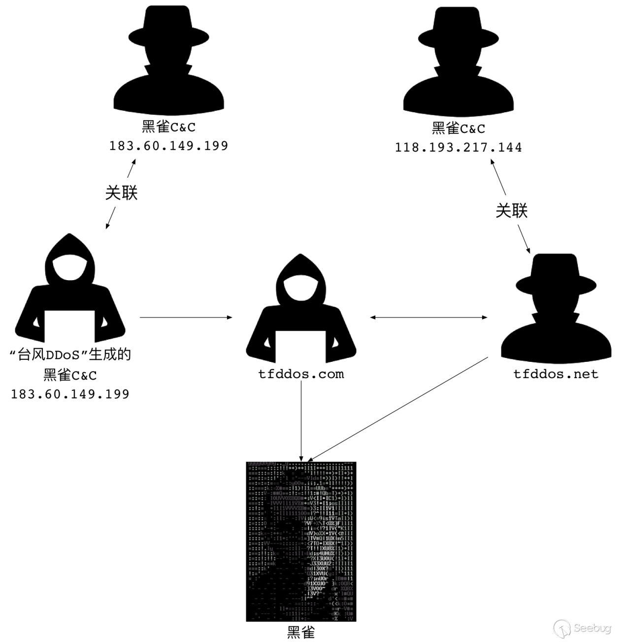 從以上分析可以看出三個黑雀C&C(183.60.149.199、118.193.217.144、aaa.tfddos.net)實則為同一個黑客或者黑客組織所控制。為了更清晰的描述這些IP和域名之間的聯系,總結出關系圖如下: