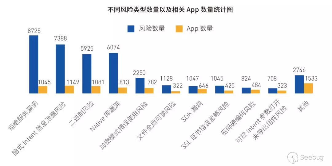 在安全風險的類型方面,拒絕服務漏洞、隱式 Intent 信息泄露以及二進制三類安全風險的數量最多,且影響的 App 數量也位列前三。其中,超 80% 的移動應用皆存有隱式 Intent 信息泄漏風險。利用這些已深度侵入到 Android 應用內的漏洞,攻擊者即可實現對用戶信息的綁架、資費的惡意扣取與消耗等,甚至將多種風險進行整合構建,形成貫穿應用開發、上架和用戶交互等全流程的攻擊鏈路,從而容易引發高達億級的應用安全危機。