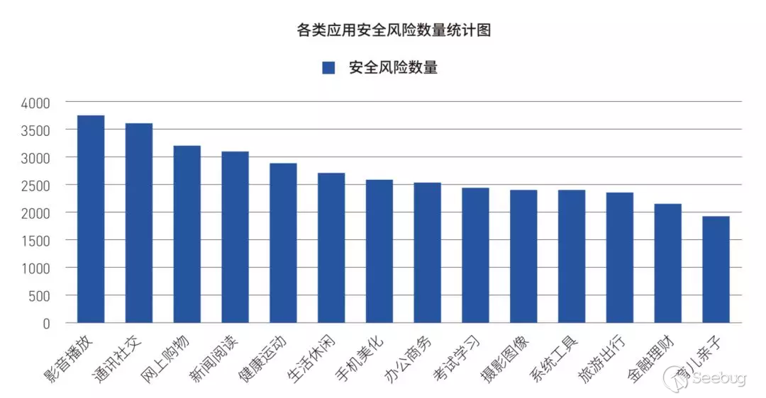 《白皮書》數據顯示,影音播放類 Android 應用存在的安全風險數量最多,其次是通訊社交和網上購物類應用。相對于其他類型的移動應用,這三類應用的產品功能和交互方式都較豐富,且具有較高的用戶黏性。存在其中的安全風險一旦爆發,影響的用戶量級和范圍將大大超乎預期。