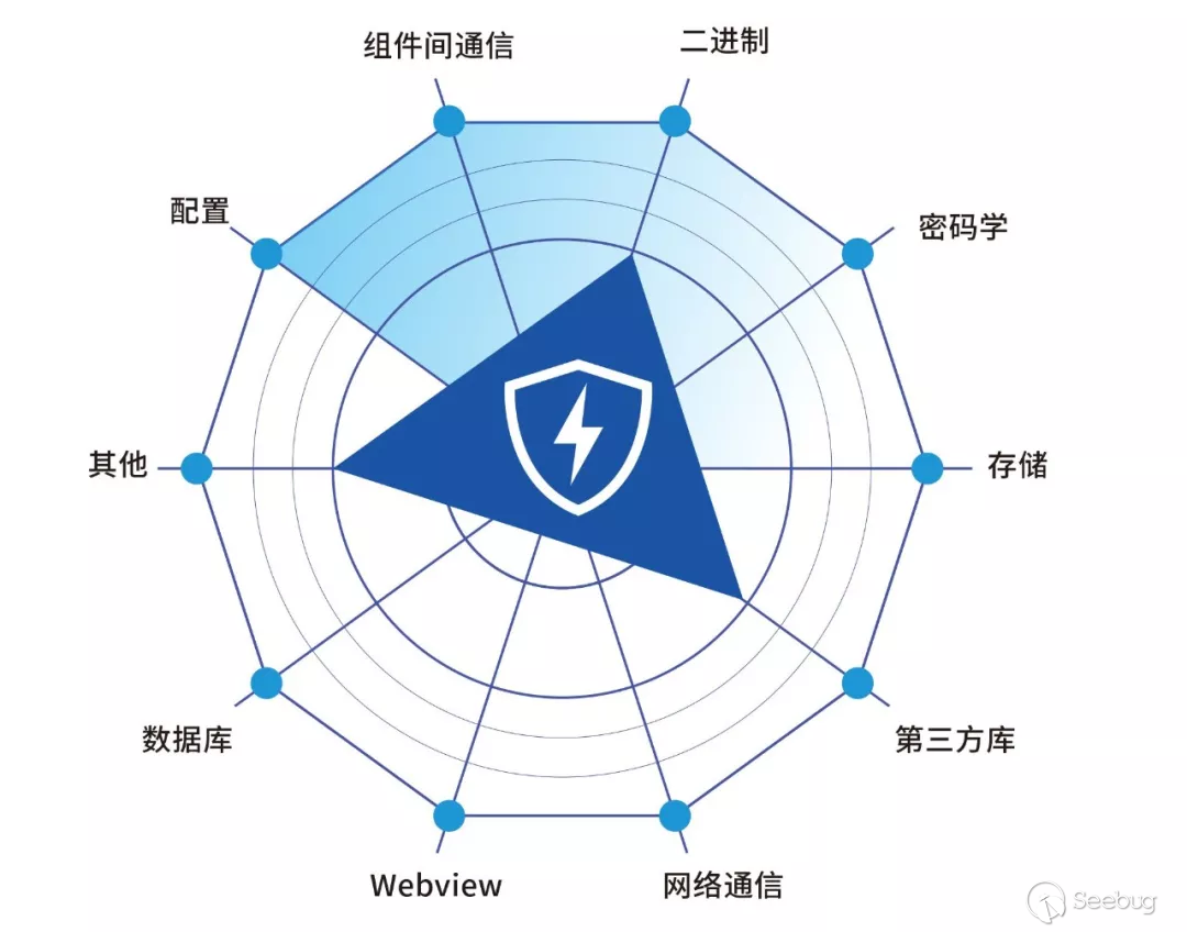 同時,騰訊安全科恩實驗室還基于移動應用滲透測試經驗以及前沿攻擊模式分析與總結,提出了適用于移動應用面向攻擊面靜態檢測的安全自查雷達圖,協助 Android 應用開發者全面、客觀、高效地掌握移動應用靜態檢測安全風險的實時動態,為其突破安全檢測高誤報率瓶頸提供助益。