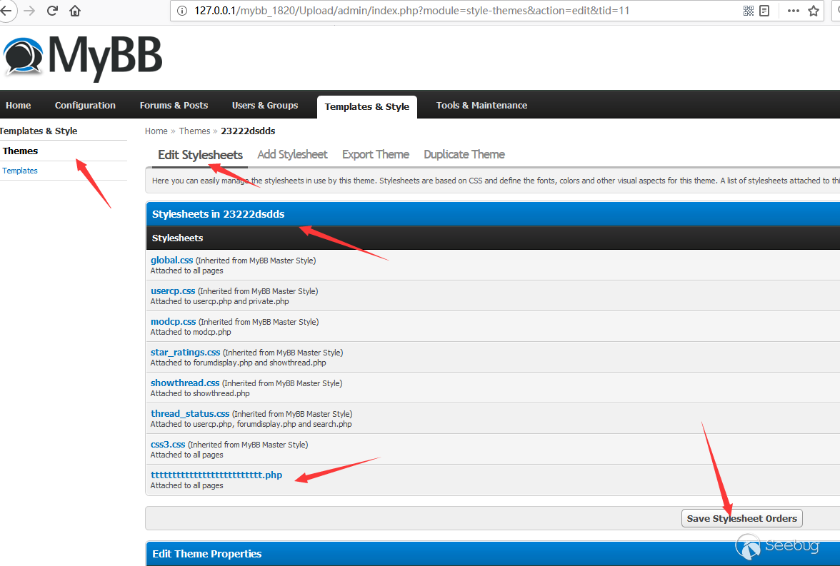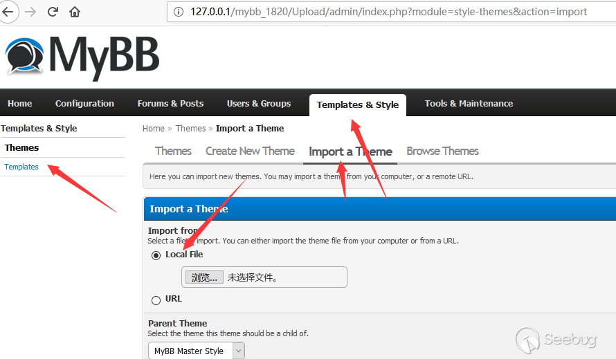 In the backend of Mybb, the admin can customize the templates and themes of CMS. In addition to the normal theme import, the admin can upload a XML file to upload many other files, and the server will directly create the corresponding css file. Of course, the server limits such admin's behavior, and it requires the admin to create only files ending in .css.