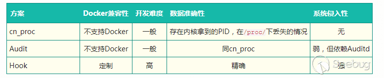 cn_proc不兼容Docker,這個可以在宿主機上部署來解決。Hook的方案,需要針對每種Linux的發行版做定制,維護成本較高,且不符合長遠目標(收購外部公司時遇到各式各樣操作系統問題)