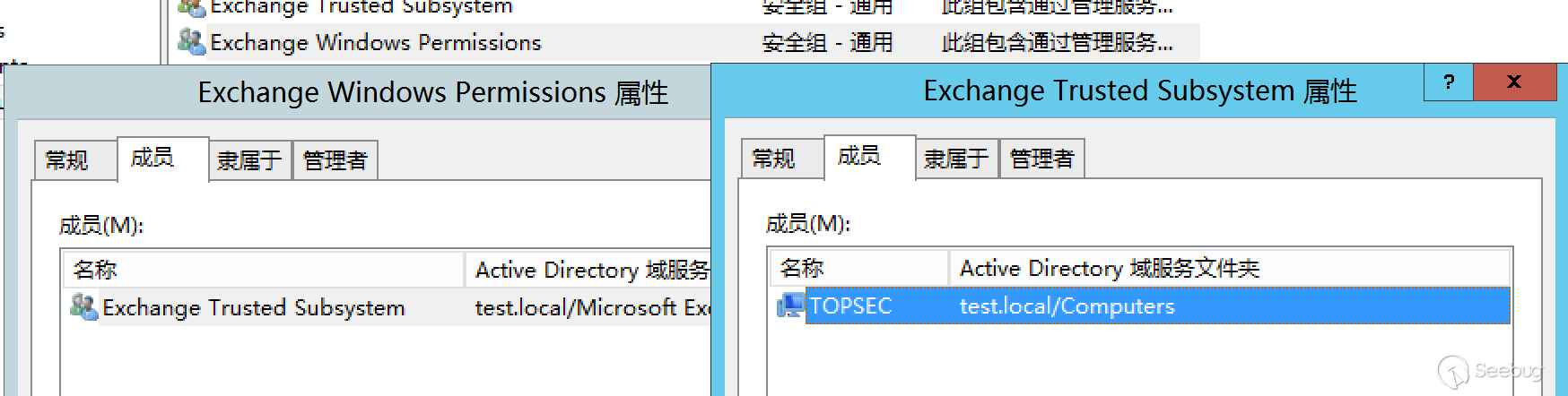 由于安裝Exchange后,Exchange在Active Directory域中具有高權限,Exchange的本地計算機賬戶TOPSEC$會被加入用戶組Exchange Trusted Subsystem,該用戶組又隸屬于Exchange Windows Permissions。Exchange Windows Permissions組可以通過WriteDacl方式訪問Active Directory中的Domain對象,該對象允許該組的任何成員修改域權限,從而可以修改當前域ACL達到提權目的。