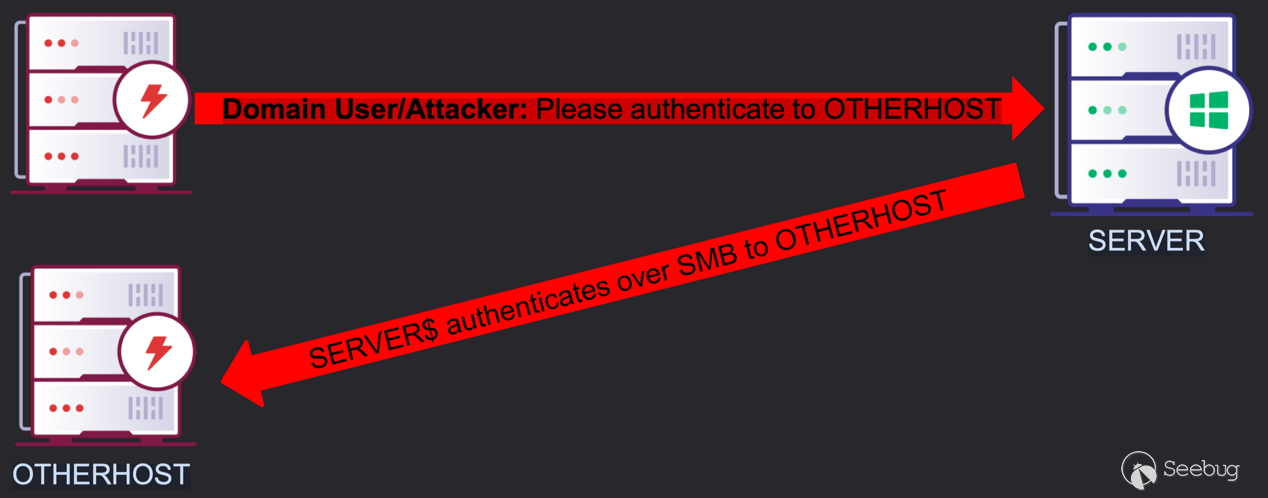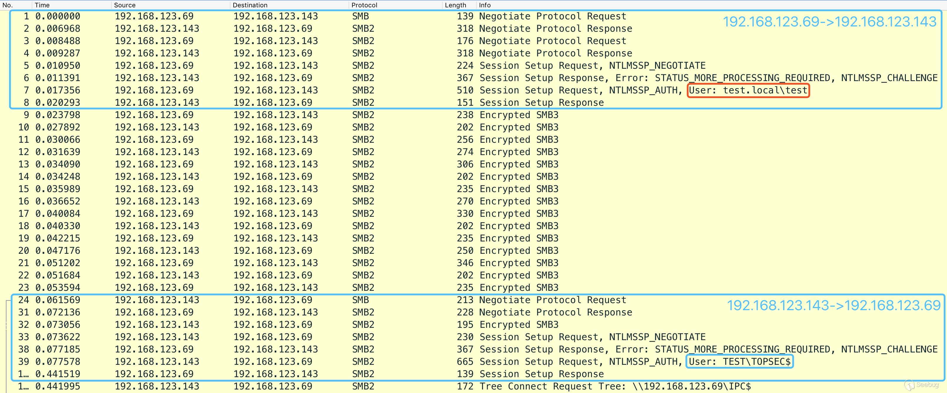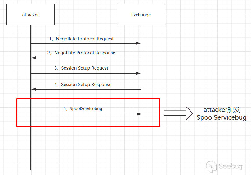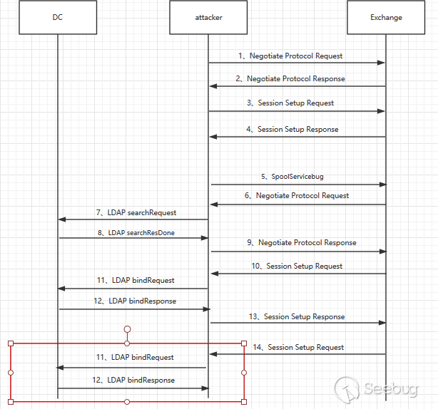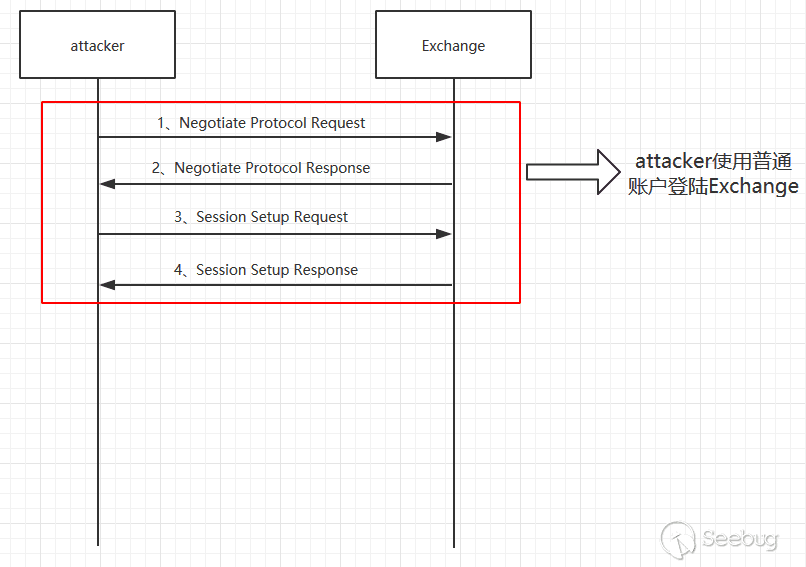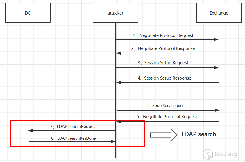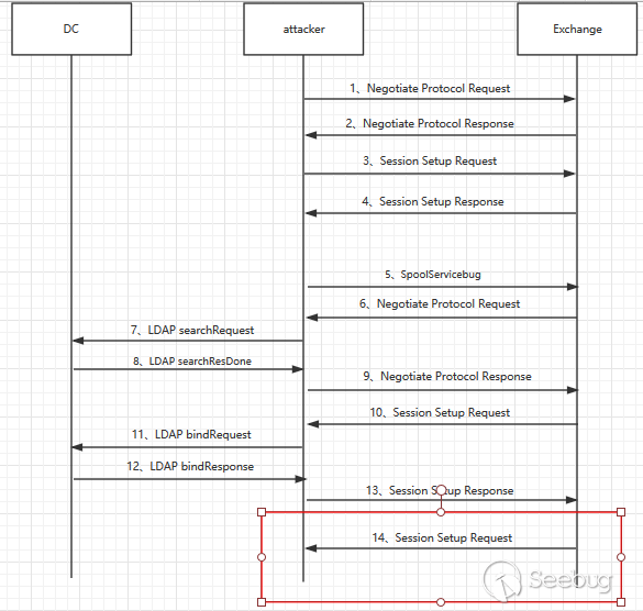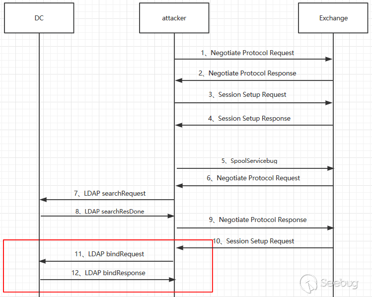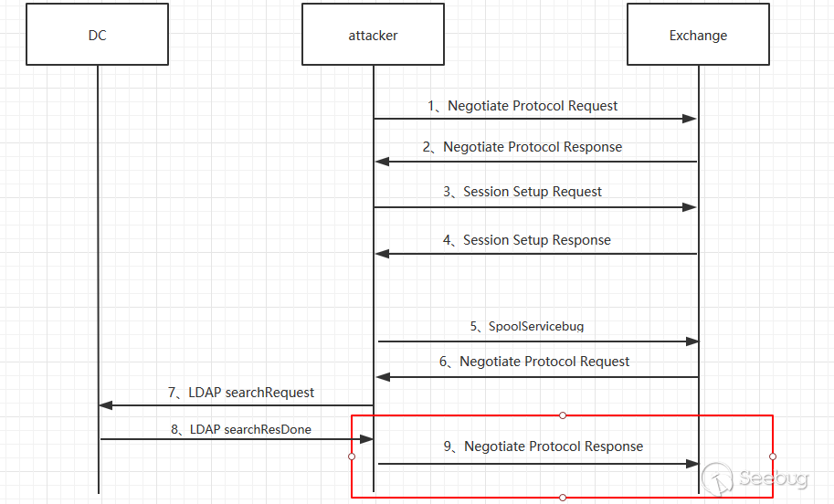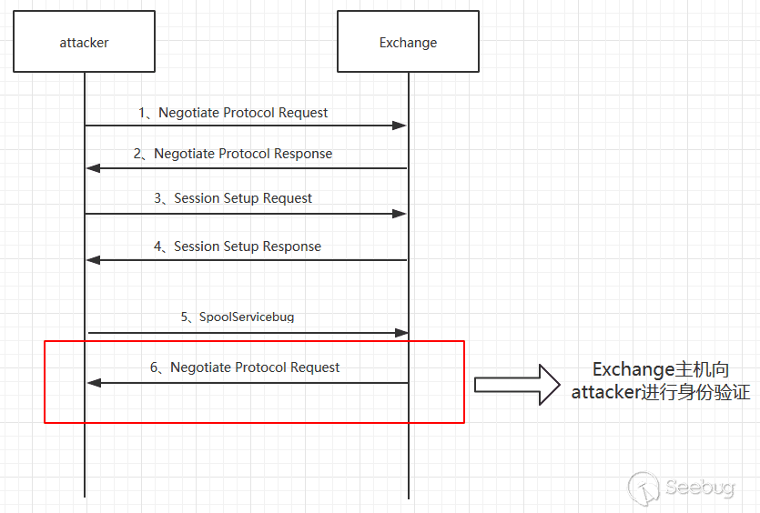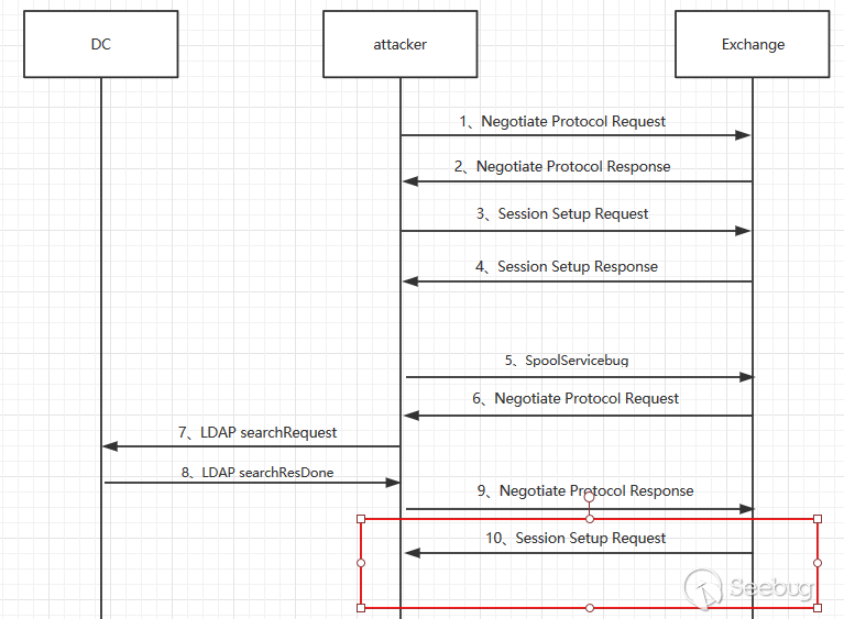 在正常的業務場景中,用戶想登陸并使用Exchange,往往需要向Exchange服務器發送SMB協商請求流量,以便驗證身份并登陸。但由于SpoolService錯誤,在這里,Exchange向Attacker發送SMB協商請求流量,以便驗證身份。這便造成了Attacker可以作為中間人身份中繼此身份認證以冒充Exchange欺騙DC的機會。
