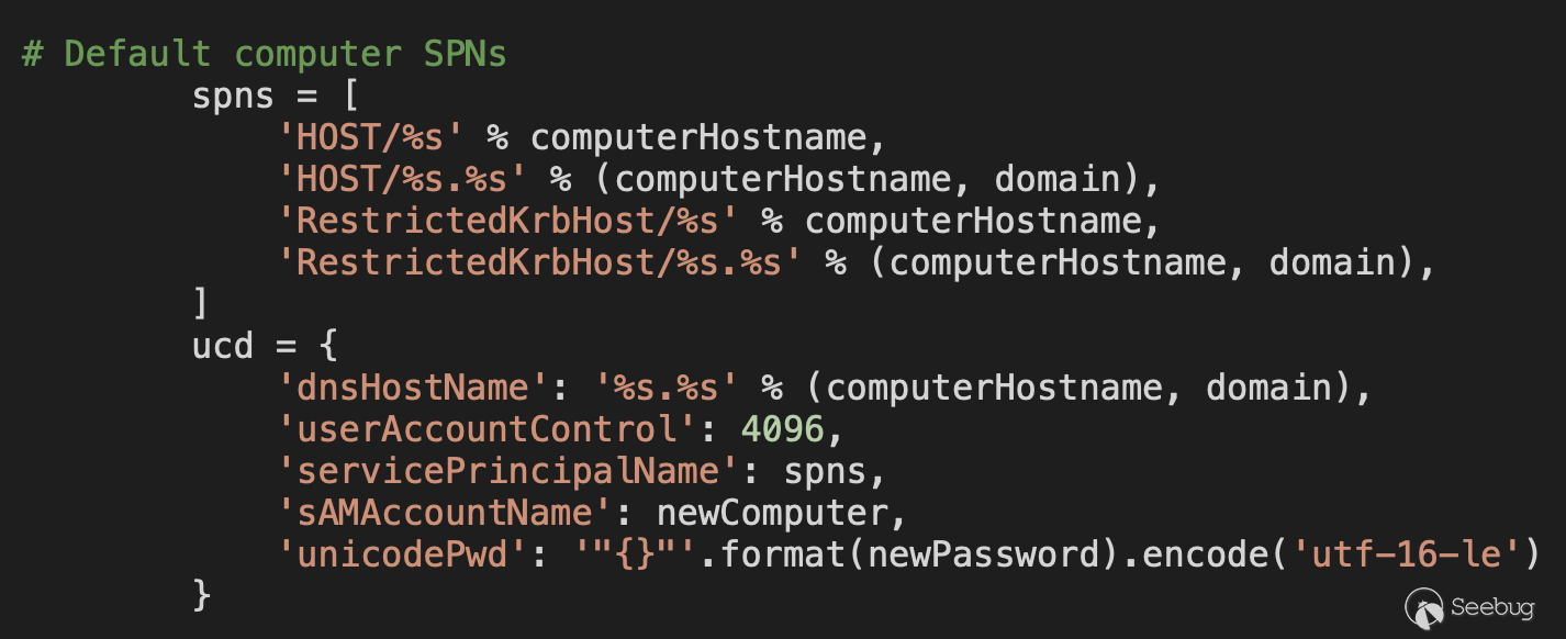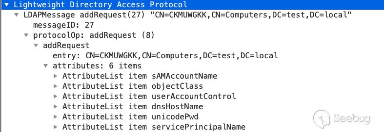 在attacker冒用SDC身份后,由于SDC計算機身份沒有修改訪問控制列表(ACL)的權限,無法直接提權。而后續提權利用中的S4U2Self不適用于沒有SPN的帳戶。在域環境中,任何域用戶都可以通過MachineAccountQuota創建新的計算機帳戶,并為其設置SPN。Attacker通過此方式新建一個域中的計算機賬號。這一過程通過LDAP實現并設置賬戶與密碼 ,如下圖