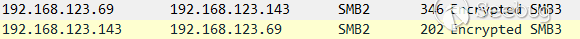 (2) 接著,printerbug.py腳本中調用RpcRemoteFindFirstPrinterChangeNotificationEx(),請求對一個新的打印作業進行更新,并令其將該通知發送給我們指定的attackerhost(192.168.123.69)。這部分數據就是上圖中Encrypted SMB3中的一部分。