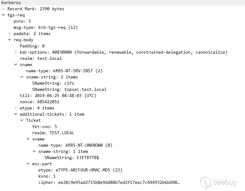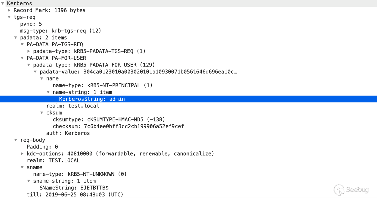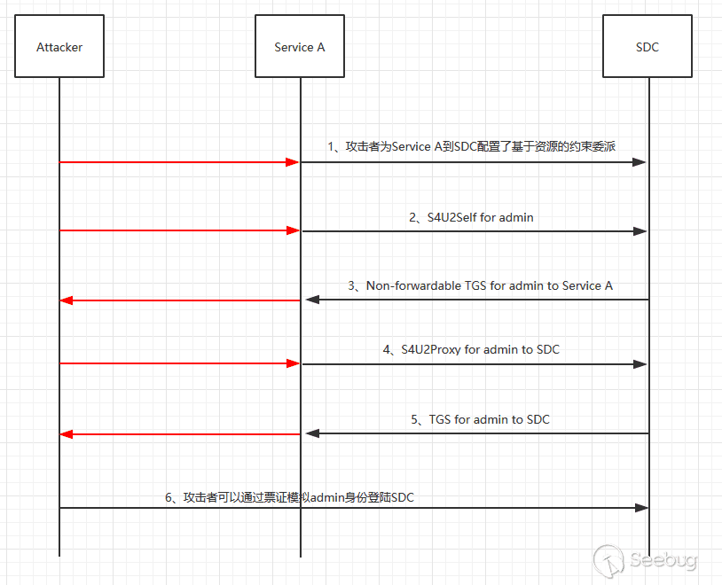 在這里,Service A為Attacker創建并控制,Attacker獲得TGS票據,利用該票據以admin身份訪問SDC,完成提權