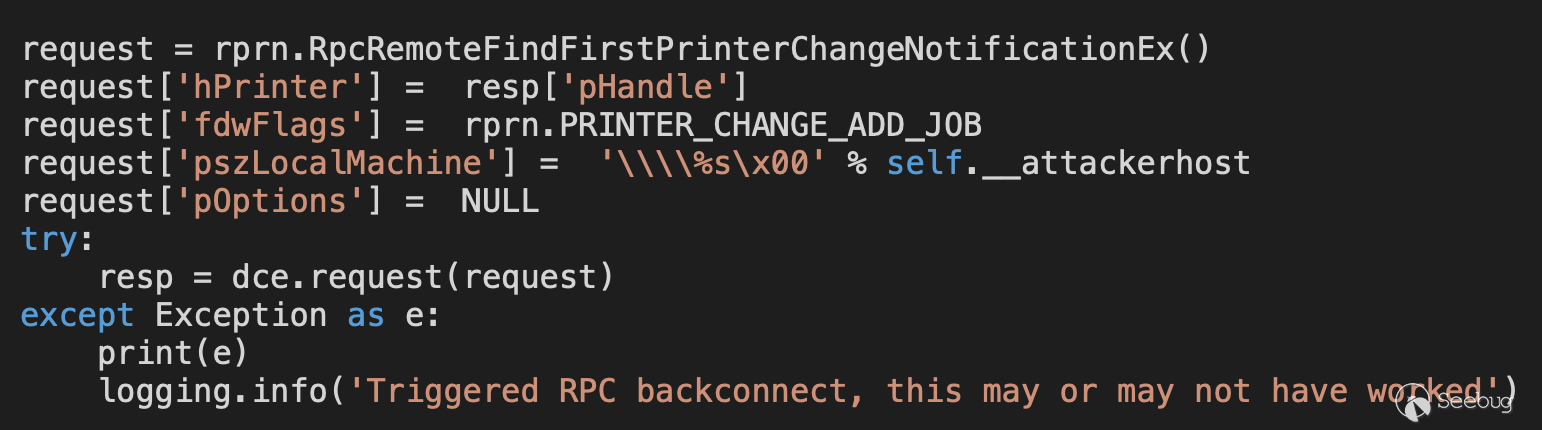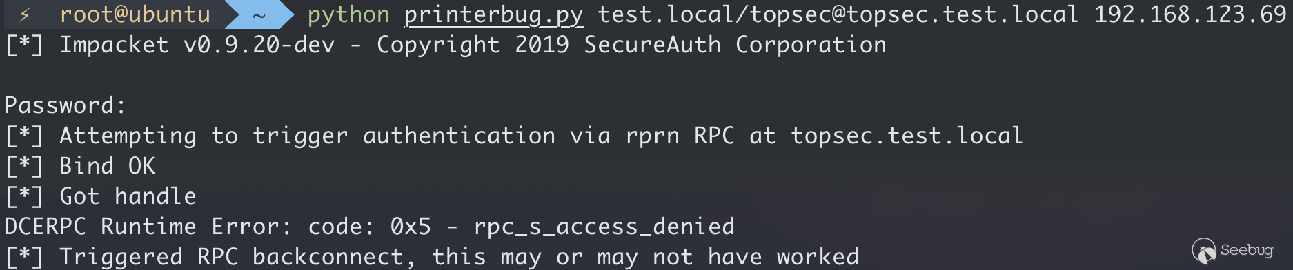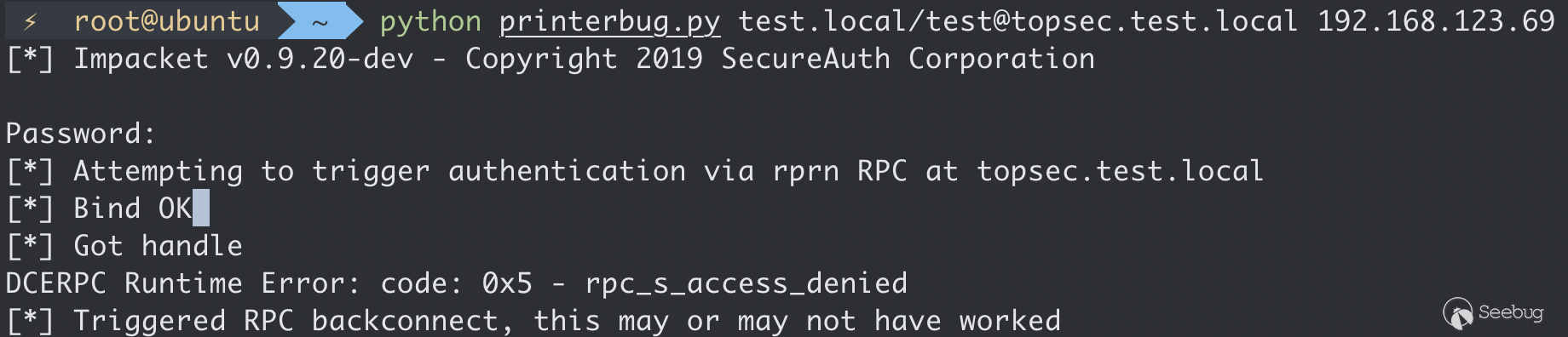 在攻擊利用流程中,需要使用到一個名為printerbug.py的工具,此工具觸發SpoolService/printer bug,強制Windows主機通過MS-RPRN RPC接口向攻擊者進行身份驗證。