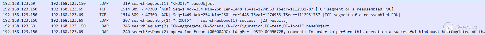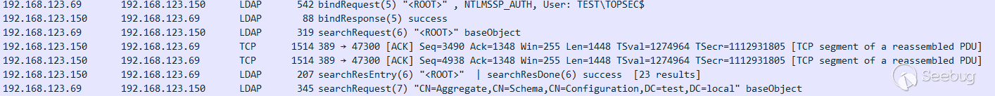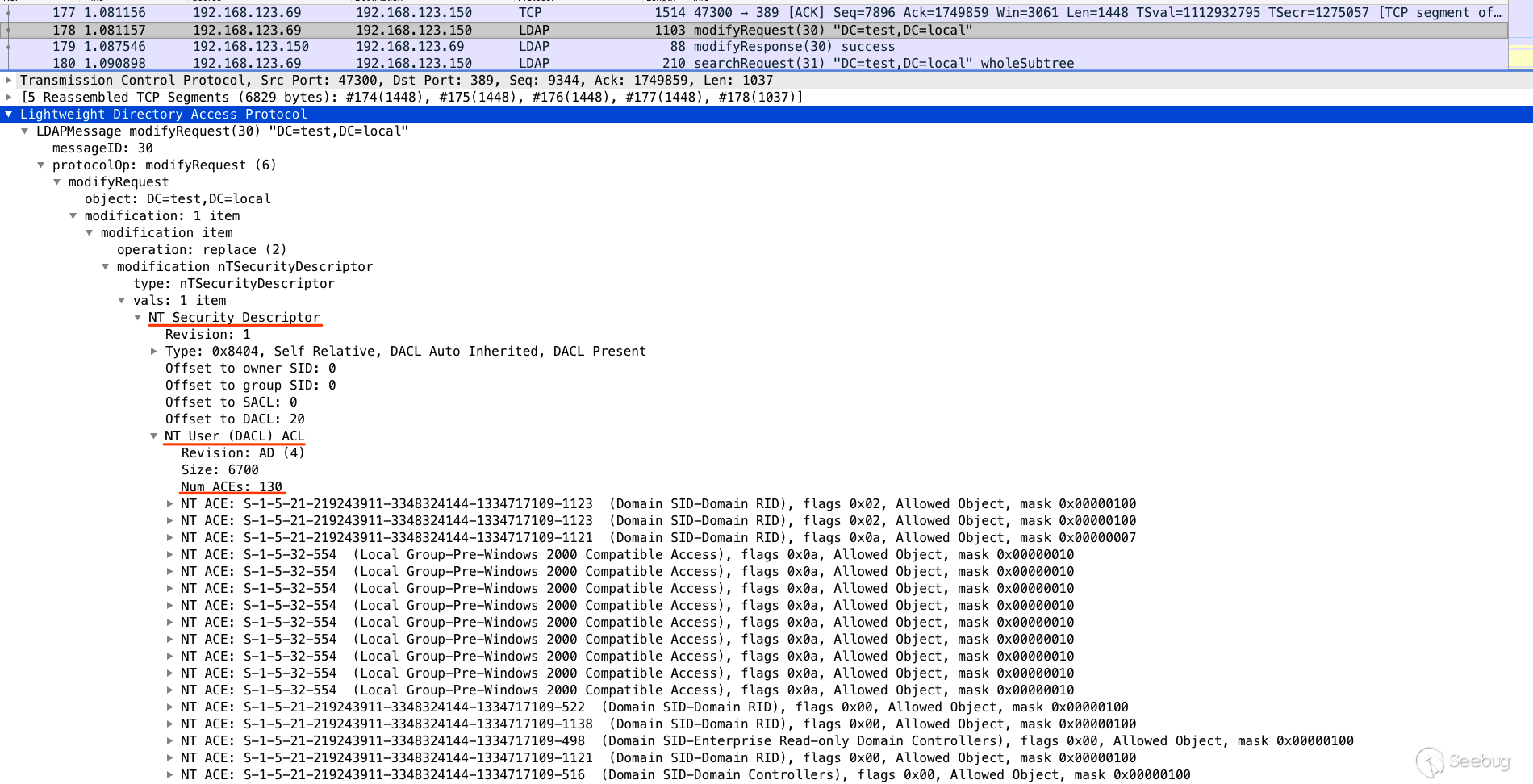 因此腳本會首選修改ACL來提權,因為這相比創建用戶的方式更隱秘一些。具體方式是通過LDAP修改域的安全描述符(Security Descriptor),可以在下面的數據包中看到ACL中每一條具體的訪問控制條目(ACE,Access Control Entries):