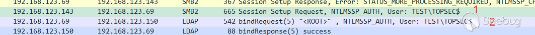 ④ printerbug.py腳本執行成功后,將觸發輔助域控制器(SDC)回連Attacker主機,回連使用的認證用戶是輔助域控制器(SDC)本地計算機賬戶TEST/TOPSEC$。