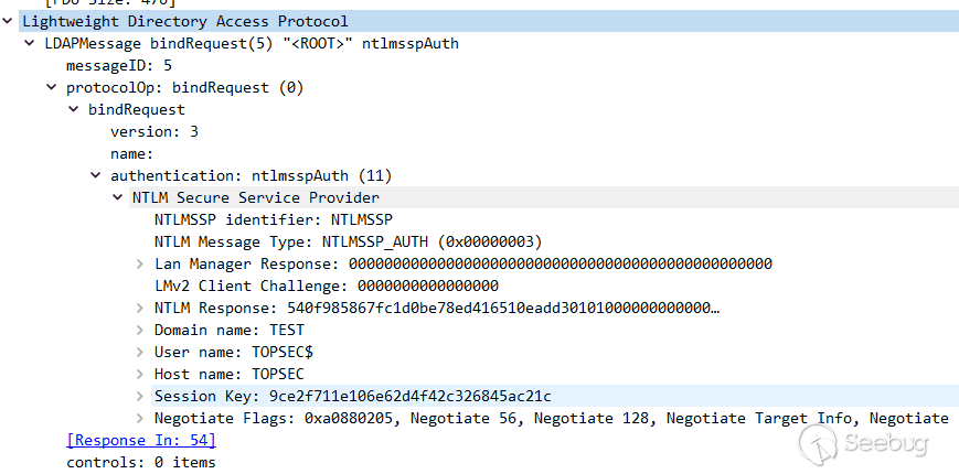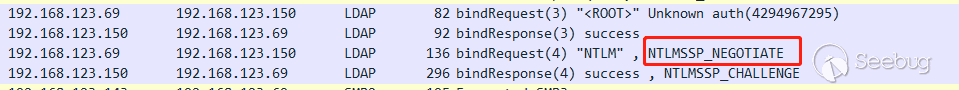 可見,在通過LDAP中繼時,已經取消設置NTLM_NEGOTIATE消息中的簽名標志(NTLMSSP_NEGOTIATE_ALWAYS_SIGN,NTLMSSP_NEGOTIATE_SIGN)