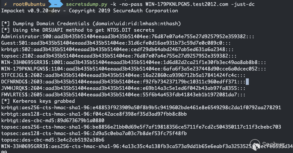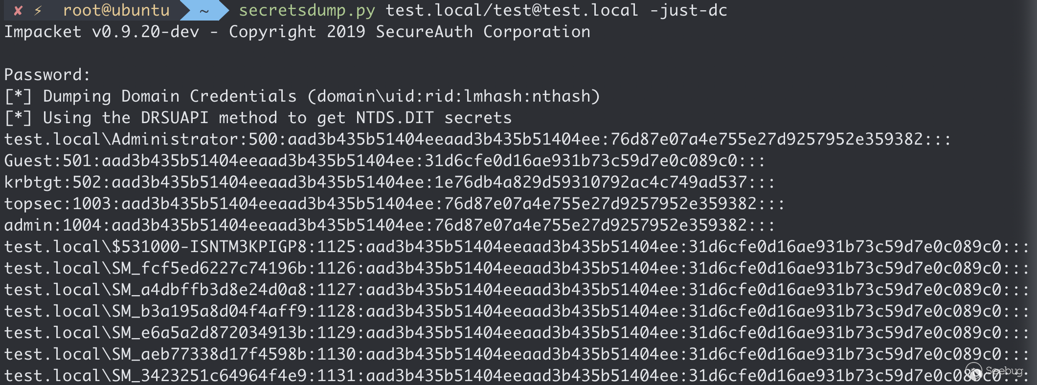 ⑤ 完成ACL的修改后,test就可以通過secretsdump.py的DCSync功能dump出所有密碼哈希值: