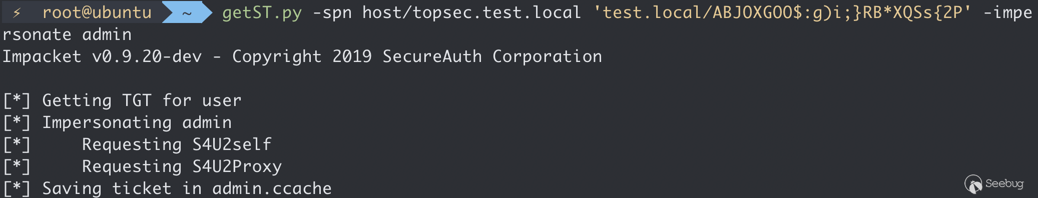 ⑤ 使用getSP.py腳本,通過-impersonate參數模擬用戶admin請求其票證,保存為ccache,admin用戶為Domain Admins組的成員,具有對輔助域控制器(SDC)的管理與訪問權限。