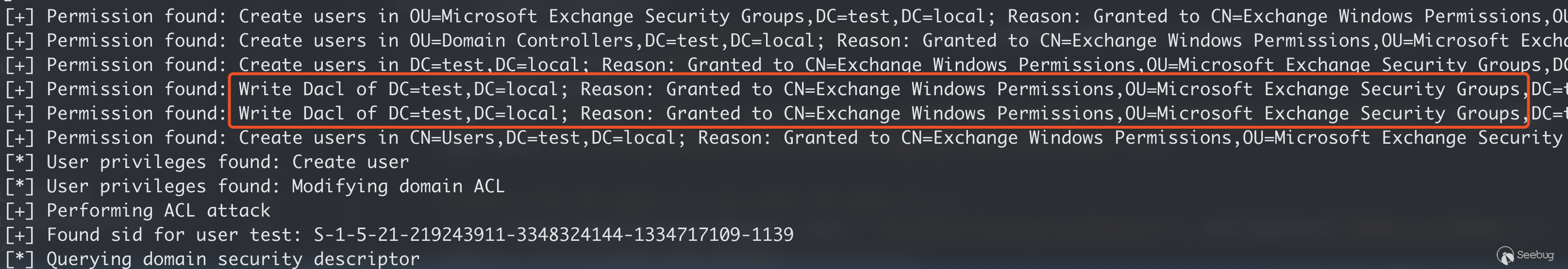 首先,通過遍歷驗證中繼帳戶所在用戶組及權限,發現當前賬戶可以創建用戶、可以修改test.local域的ACL,因為域中的Exchange Windows Permissions用戶組被允許修改ACL,如下圖所示: