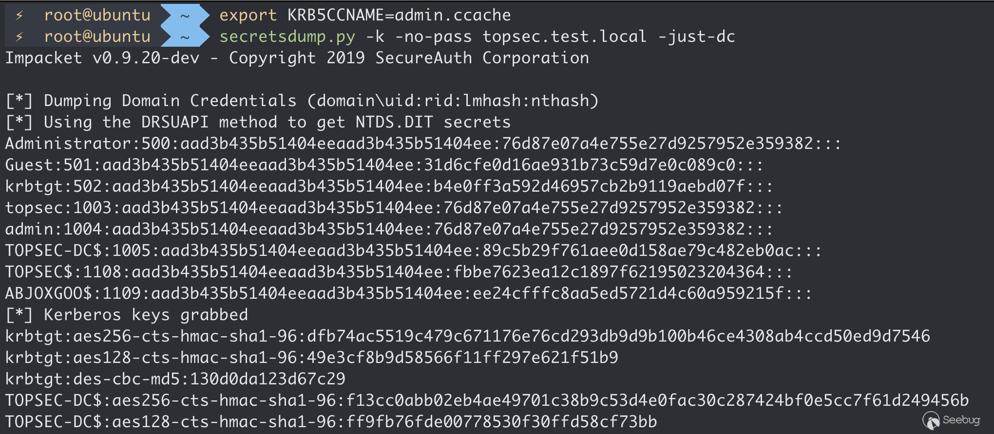 ⑥ 使用上一步驟中保存的Kerberos服務票證,我們可以在目標主機(SDC)上模擬admin身份,從而執行任何操作,例如使用secretsdump轉儲哈希值。通過secretsdump dump出所有密碼哈希值: