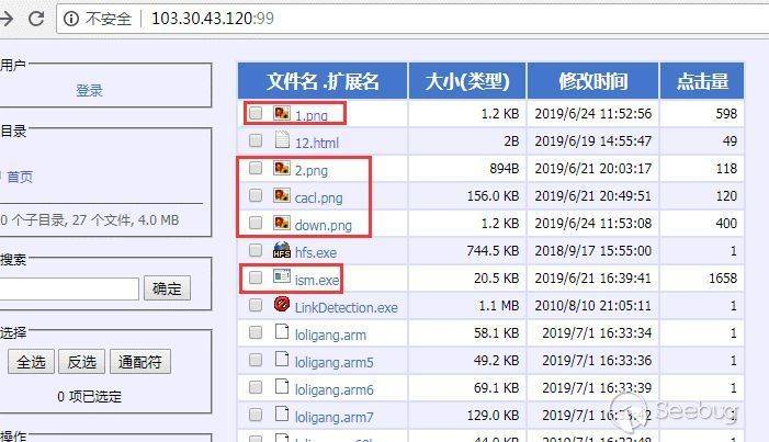 黑客在HFS服務器http[:]/103.30.43.120:99、http[:]/222.186.52.155:21541 上保存了大量的腳本及木馬文件,包括命名后綴為png、vm、sh的腳本,windows平臺運行的PE格式文件,Liunx平臺運行的ELF格式文件