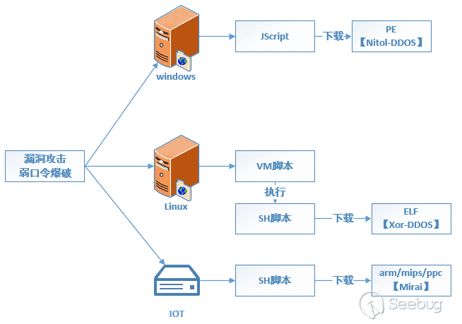 Nitol木馬入侵Windows系統后會通過IPC$弱口令爆破感染內網中的其他機器,然后連接控制端地址,接受控制指令進行DDoS攻擊。感染Linux系統的XorDDoS會在/etc/init.d中創建副本,然后創建一個新的cron.sh腳本并將其添加到定時任務,最終目標為對其他機器發起DDoS攻擊。Mirai病毒感染IoT設備,根據不同的CPU架構植入不同的二進制文件,然后對隨機生成的IP地址進行探測攻擊,接受指令對目標發起DDoS攻擊。
