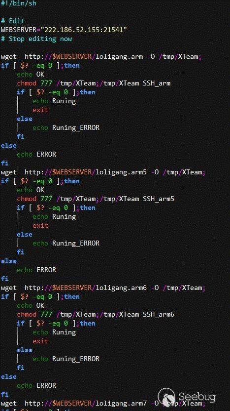 該服務器上還發現保存有多個mirai病毒變種,每個變種對應一個特定的平臺。Mirai感染受害者設備后,會釋放一個shell腳本ssh.sh,shell腳本會下載和執行與當前架構相適應的可執行文件。包括針對以下CPU架構而構建的二進制文件:arm、arm5、arm6、arm7、mips、mpsl、ppc、sh4、spc、xb6、m68k