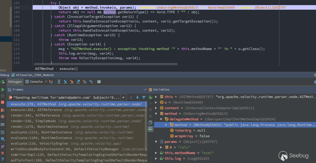 對比一下兩個處理流程,當發送正常反饋時,writeEncodedBody()中調用的是this.getVe().mergeTemplate,通過Velocity引擎的ClasspathResourceLoader()類的getResourceStream()方法加載模板文件,此處的模板是templates/email/html/contactadministrator.vm,隨后還會進行header、footer等正常加載流程,最終渲染出整個頁面。而發送payload時,通過asPlainText()創建出TemplateSource$Fragment對象,再通過DefaultRenderRequest構造方法把source成員變量賦值為這個Fragment對象,于是進入第一個分支,調用的是this.getVe().evaluate(),最終調用ASTMethod.execute(),這正是前面說的差異性導致的兩個不同處理邏輯。