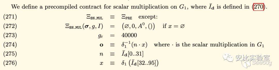 我們知道以太坊內置了多個預編譯合約,進行橢圓曲線上的密碼學運算,降低 zkSNARKs 驗證在鏈上的 Gas 消耗。函數scalar_mul()的實現則調用了以太坊預編譯 7 號合約,根據 EIP 196 實現了橢圓曲線 alt_bn128 上的標量乘法[5]。下圖為黃皮書中對該操作的定義,我們常稱之為 ECMUL 或 ecc_mul。