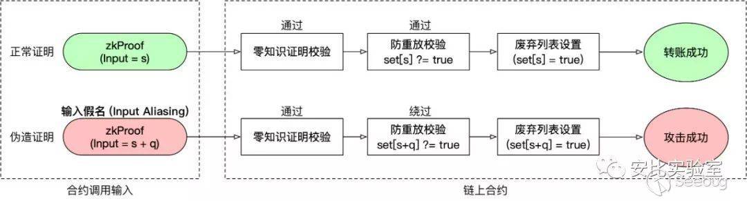 然而事與愿違,這里忽視了一個致命問題。攻擊者可根據已成功提交的證明,利用「輸入假名」漏洞,對原輸入稍加修改便能迅速「偽造證明」,順利通過合約第 82 行的零知識證明校驗,并繞過第 83 行的防雙花檢查。